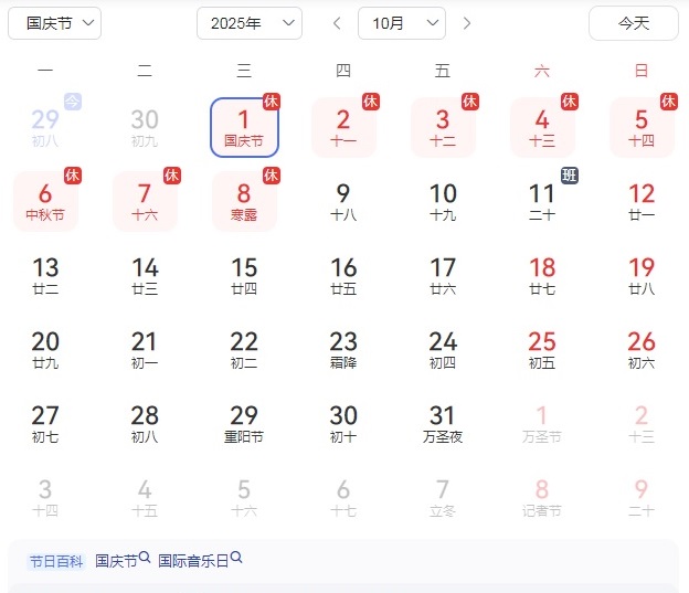 2025年10月1日至8日放假共8天,10月9日(星期四)正式上班;10月11日(星期六)正常上班。